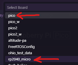 Switch Boardin the Pico extension. The dialog box that pops up will provide many options, some internal and some defined by us; select the one for whichever board you'll be uploading to, usuallypico(a standard Pico 1) orrp2040_micro(an ADS PCB, as defined in that header file). If it prompts you forRISC-V Usage, clickNo. Once this is done, you're ready to debug!