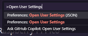 CTRL + SHIFT + Pin VSCode to open the Command Palette, then type in and selectOpen User Settings (JSON)- then scroll to the bottom of the file that just opened.