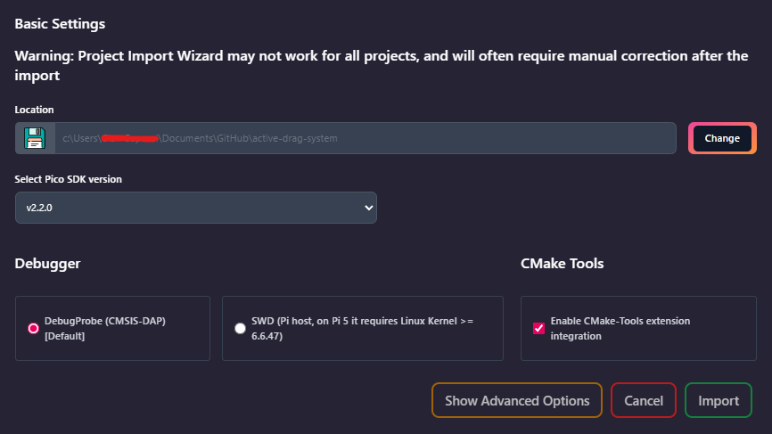 changeon theLocationbox, and select the repository directory - in this case,active_drag_system. All of the other options should be fine left as defaults, with one exception: click the checkbox that saysEnable CMake-Tools extension integration. ClickImportonce completed.