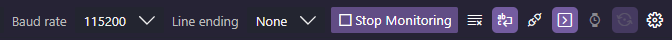 SERIAL MONITORtab of the bottom box that opened during the upload process to open the extension. Inside it, select the COM port that the board has opened - the easiest way to determine this if there are multiple is to unplug it, and see which one disappears. Select theToggle Terminal Modebutton (the one with a lil' shell icon on it) as depicted below, and then clickStart Monitoring- this should give you a full interactive serial terminal with the board, right inside VSCode!