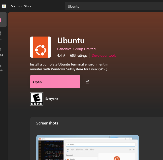 There are a couple of commands, mainly for working with git, that we'll need to run in a native bash terminal; to do this, we'll need to install a "distro" of Linux into the Windows Subsystem for Linux, or WSL. Notably, as the primary reason for doing this is to get direct commandline git access, if you have some other means of accessing it such as the Git for Windows toolkit, then you can skip this step and use it instead whenever a step says to open a WSL terminal.